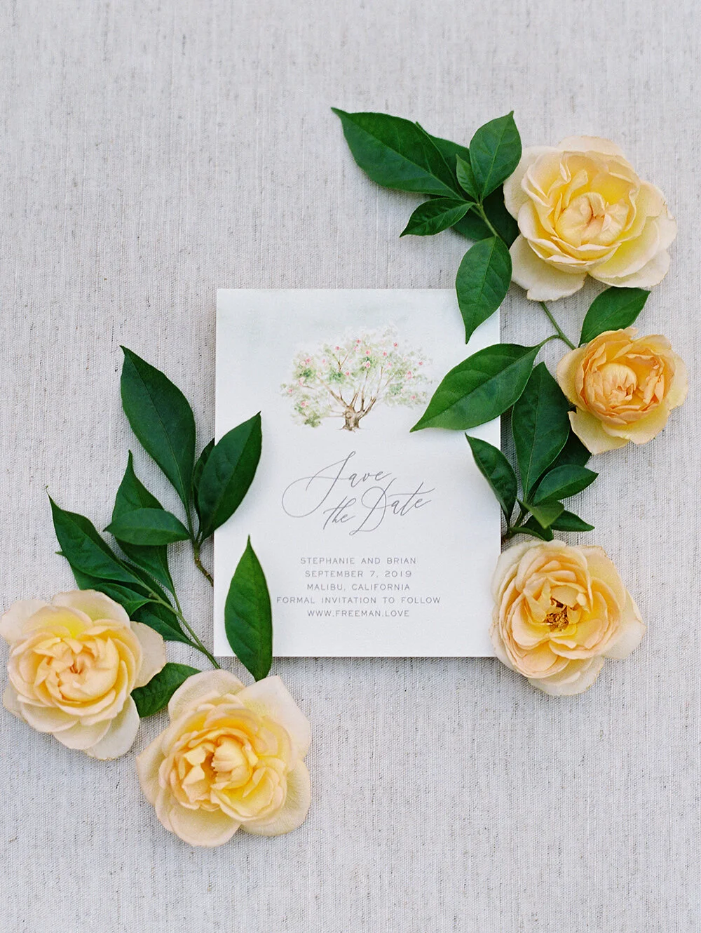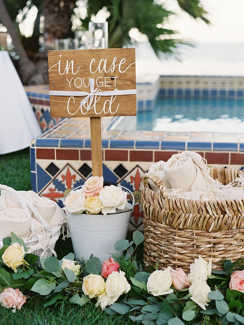Having such a magical location to begin with, Stephanie and Brian opted to reflect the gorgeous scenery with an intentional color palette: ocean blues, lush greens and sunset hues. Even their invitation suite included a watercolor sketch of the large oak tree that they were married under and served as a sweet nod to their engagement session in the countryside. The thoughtful details continued with baskets of flip-flops and throws for all of the guests to use as they dined under the stars.